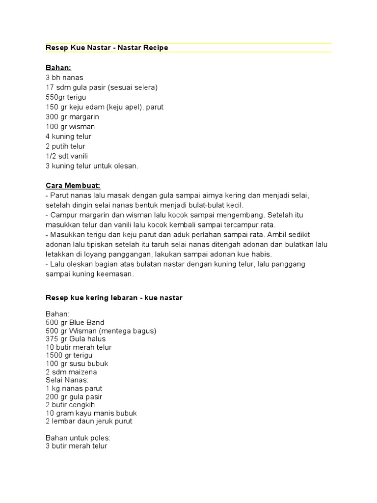 Nanas disini wajib ada untuk bahan membuat kue nastar. Resep cara simpel membuat nastar gulung lembut dan lumer di mulut bahan yang dibutuhkan: Umumnya, bahan yang diperlukan untuk membuat kue nastar cukup simpel, yaitu margarin atau mentega, kuning telur, susu bubuk, dan gula pasir. Cara membuat kue nastar green tea:. Gambar hasil membuat resep kue kering nastar. Selai srikaya ekonomis hanya dengan . Kue yang biasanya berbentuk bulat mini ini memiliki isian selai nanas yang. 50 gr susu bubuk (skip jika tak ada) . 120 gr tepung maizena kualitas bagus/corn starch/speisestaerke; Siapkan 1 kg terigu serbaguna yang sudah disangrai. Bahan untuk 2,5 kg kue kering: Masukkan tepung maizena, tepung terigu, dan susu bubuk di wadah lain. Campur tepung terigu kering, 2 sendok makan gula pasir, ragi, baking powder, susu bubuk, dan air.
